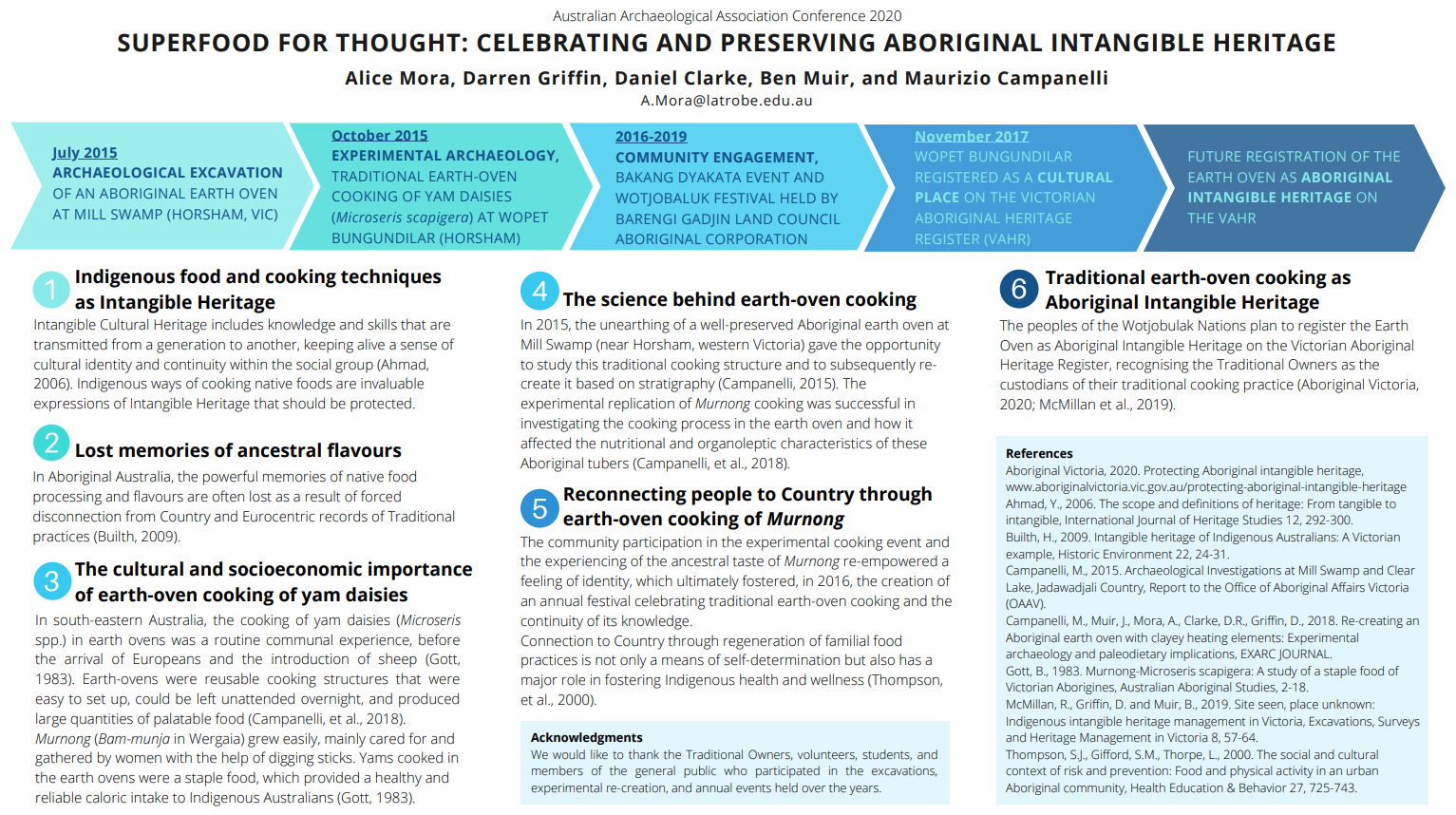 This paper explores how stratigraphic reconstruction of the archaeological record, experimental archaeology and community engagement came together to successfully revitalise the traditional way of cooking one of the most symbolic and nutritionally important Aboriginal tubers. It is highlighted the significance of cooperatively practising earth-oven cooking and experiencing the familial taste of Murnong in reconnecting people to Country. Moreover, it is described how the re-empowered feeling of identity fostered the creation of an annual festival event celebrating traditional earth-oven cooking and the continuity of its knowledge.
